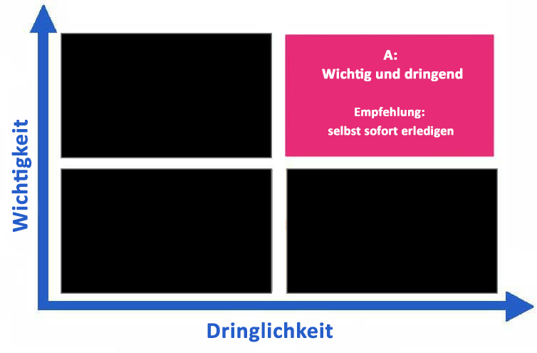 Um zu verhindern, dass Aufgaben in Quadrant A landen, ist es wichtig, Aufgaben aus anderen Sektoren rechtzeitig zu erledigen. Sollten dennoch Aufgaben in diesem Quadranten verbleiben, dann sollten es folgende sein:
