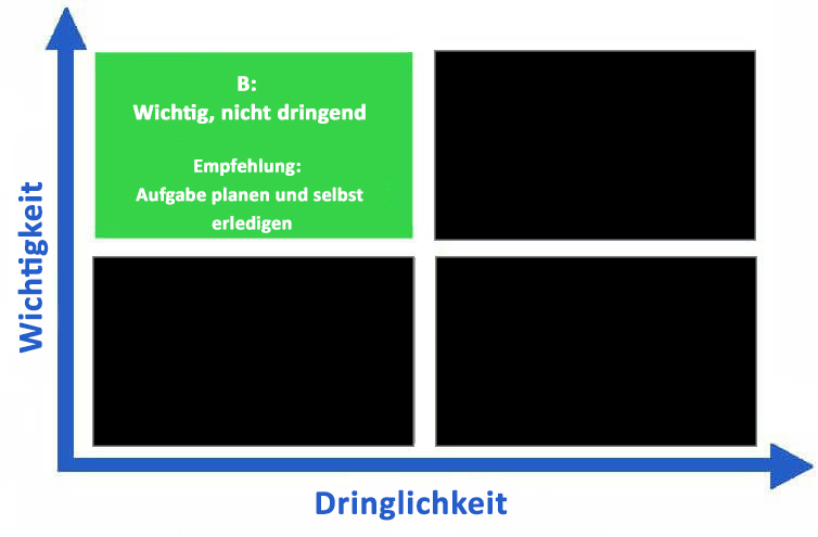 Beachten Sie, dass die fehlende Dringlichkeit es erlaubt, solche Aufgaben bewusster und konstruktiver anzugehen. Dies gibt der Person die Möglichkeit, ihr Potenzial voll auszuschöpfen, alle Aspekte selbstständig zu betrachten und ihre Zeit effektiv zu managen. Es ist jedoch wichtig zu bedenken, dass Aufgaben aus Quadrant B leicht in Quadrant A übergehen können, indem sie noch wichtiger und sofortiges Handeln erforderlich werden.