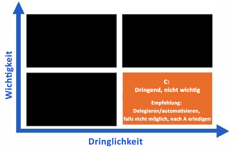 Beispiele für Aufgaben in Quadrant C sind Meetings oder Verhandlungen, die von anderen aufgezwungen werden; Geburtstagsfeiern von Bekannten, plötzliche Haushaltsaufgaben, die Lösung von nicht lebenswichtigen, aber ablenkenden Problemen (eine zerbrochene Vase, eine kaputte Mikrowelle, eine durchgebrannte Glühbirne usw.) sowie andere Aufgaben, die Sie nicht voranbringen, sondern nur bremsen.
