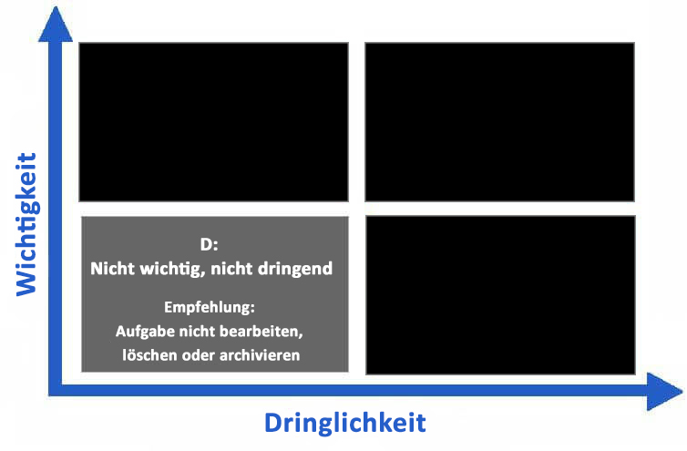 Falls Sie nicht völlig auf die Aufgaben aus Quadrant D verzichten möchten, sollten Sie deren Erledigung aufschieben, bis die Aufgaben aus Quadrant B und C abgeschlossen sind. Die Zeit für Aufgaben aus Quadrant D sollte minimiert werden. Hier passt das bekannte Sprichwort: „Der Arbeit eine Zeit, dem Vergnügen eine Stunde.“