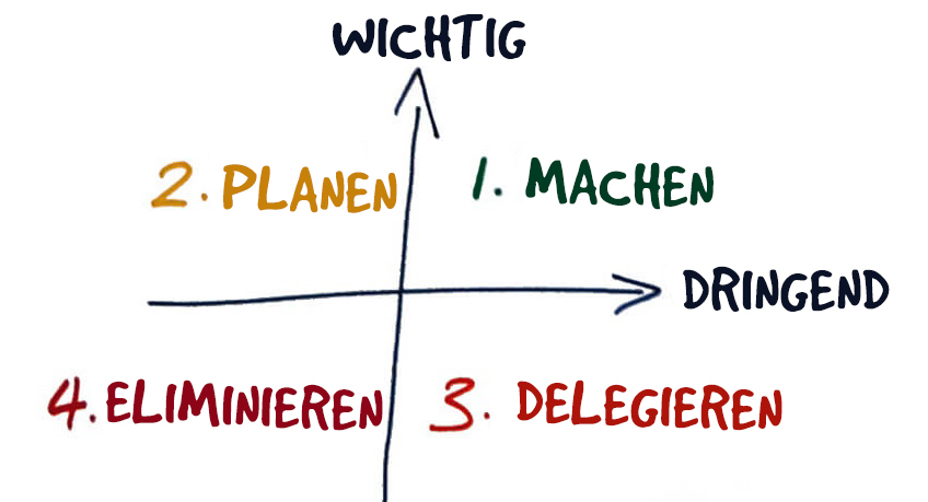 Die Eisenhower-Matrix ist eine Methode des Zeitmanagements, um die Prioritäten von Aufgaben für den Tag festzulegen. Die Matrix besteht aus vier Quadranten, die durch das Zusammenspiel der horizontalen Achse „Wichtig – Unwichtig“ und der vertikalen Achse „Dringend – Nicht dringend“ entstehen.