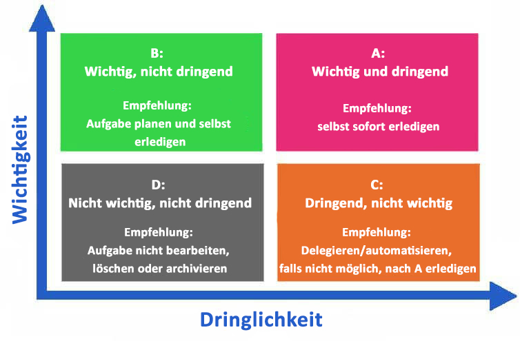 Außerdem ist das Konzept des „Delegierens“ wichtig. Wenn Sie Aufgaben in Quadrant A haben, die Sie an jemand anderen abgeben können, sollten Sie diese Möglichkeit nutzen, um sich schnellstmöglich anderen wichtigen und dringenden Aufgaben zu widmen.
