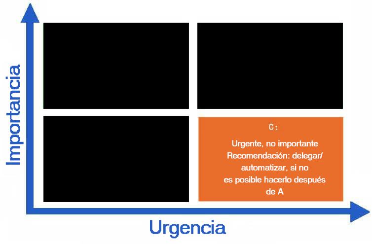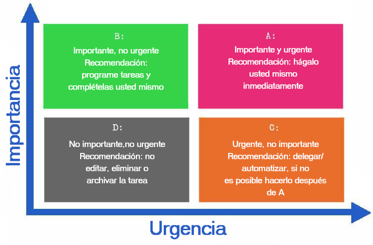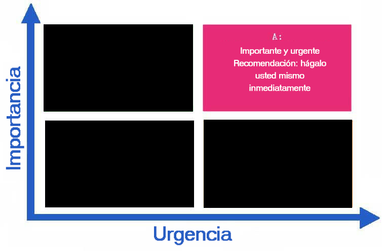 También es importante recordar el concepto de "delegación". Cuando tienes tareas en el cuadrante A que puedes delegar a alguien más, debes aprovechar esta oportunidad para abordar otras tareas importantes y urgentes lo más pronto posible.