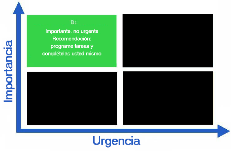 Los especialistas experimentados en gestión del tiempo recomiendan que incluyas en el cuadrante B todas las tareas actuales relacionadas con tus actividades principales, la planificación y análisis del trabajo, el entrenamiento y los deportes, el cumplimiento de un horario y dieta óptimos - todos los elementos que componen nuestra vida cotidiana.