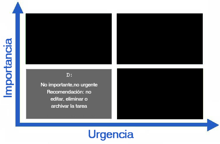Si no puedes eliminar completamente las tareas del cuadrante D o no quieres hacerlo, entonces deberías posponer su ejecución hasta que las tareas de los cuadrantes B y C estén completadas. El tiempo dedicado a las tareas del cuadrante D debe minimizarse. Aquí, el dicho bien conocido es apropiado: "Los negocios antes del placer".