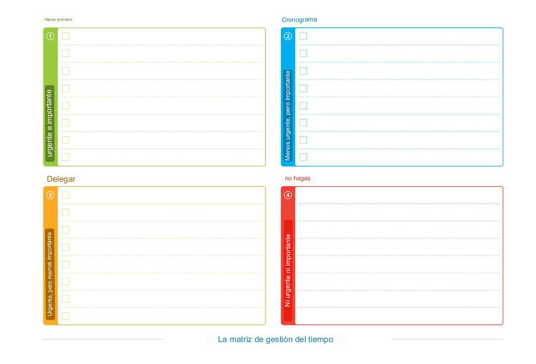 La Matriz de Eisenhower es un método de gestión del tiempo para determinar las prioridades de las tareas del día. La matriz consta de cuatro cuadrados, que se forman en la intersección del eje horizontal "Importante - No Importante" y el eje vertical "Urgente - No Urgente".