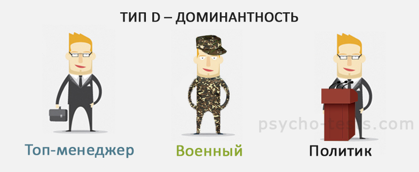 Люди типа D в первую очередь индивидуалисты. Последнее слово в принятии решений должно быть за ними. Эта черта характера ведет к стремлению занимать управленческие должности, заниматься предпринимательской деятельностью или другими формами выражения личных способностей. В некоторых случаях это может приводить к чрезмерному давлению на других, навязыванию своего мнения и игнорированию потребностей окружающих.