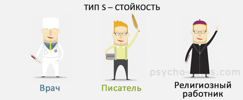 Людям типа S комфортно работать в стабильных, предсказуемых условиях. Они довольно практичны, всегда ищут наиболее оптимальный способ решения проблем. Они могут справляться сразу с несколькими задачами. Они могут работать довольно медленно, но двигаются к результату шаг за шагом.