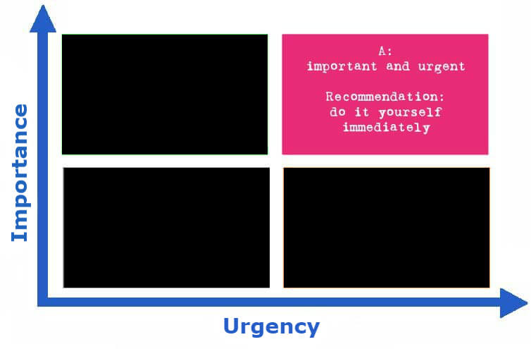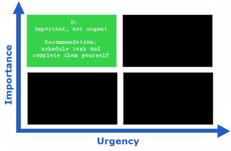 Также важно помнить о понятии «делегирование». Когда у вас есть задачи в квадранте A, которые вы можете делегировать кому-то другому, вы должны воспользоваться этой возможностью, чтобы как можно скорее заняться другими важными и срочными задачами.