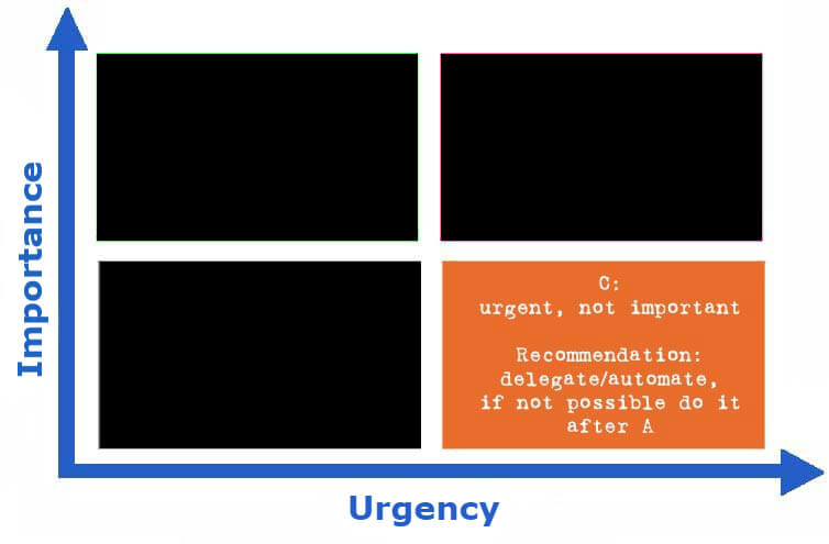 Примеры задач квадранта С - совещания или переговоры, навязанные кем-то; празднование дней рождения знакомых, внезапные домашние дела, решение нежизненно важных, но отвлекающих задач (разбитая ваза или микроволновка, перегоревшая лампочка и т.д.),а также другие задачи, которые не продвигают вас вперёд, а только замедляют.