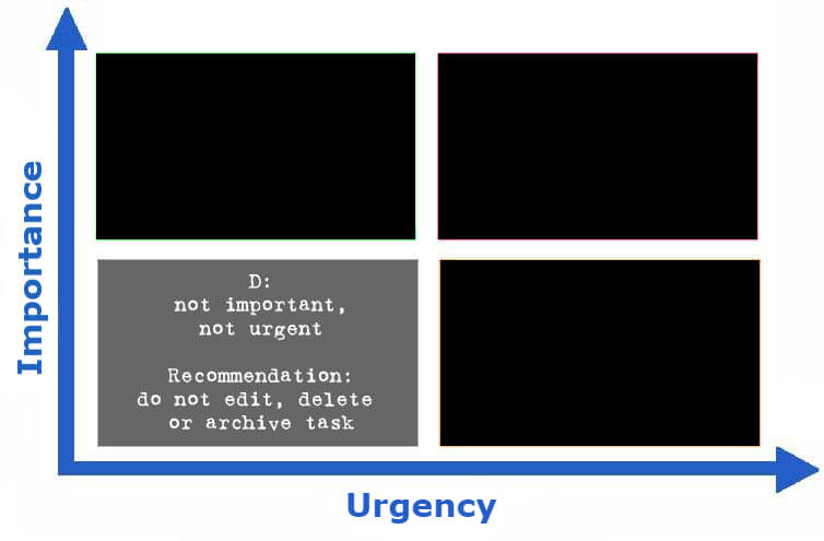 Если совсем отказываться от задач квадранта D не хочется, то их выполнение нужно откладывать до завершения задач из квадрантов B и C. Время, посвящаемое задачам квадранта D, должно быть минимизировано. Тут очень уместна известная поговорка: "Делу - время, потехе - час".